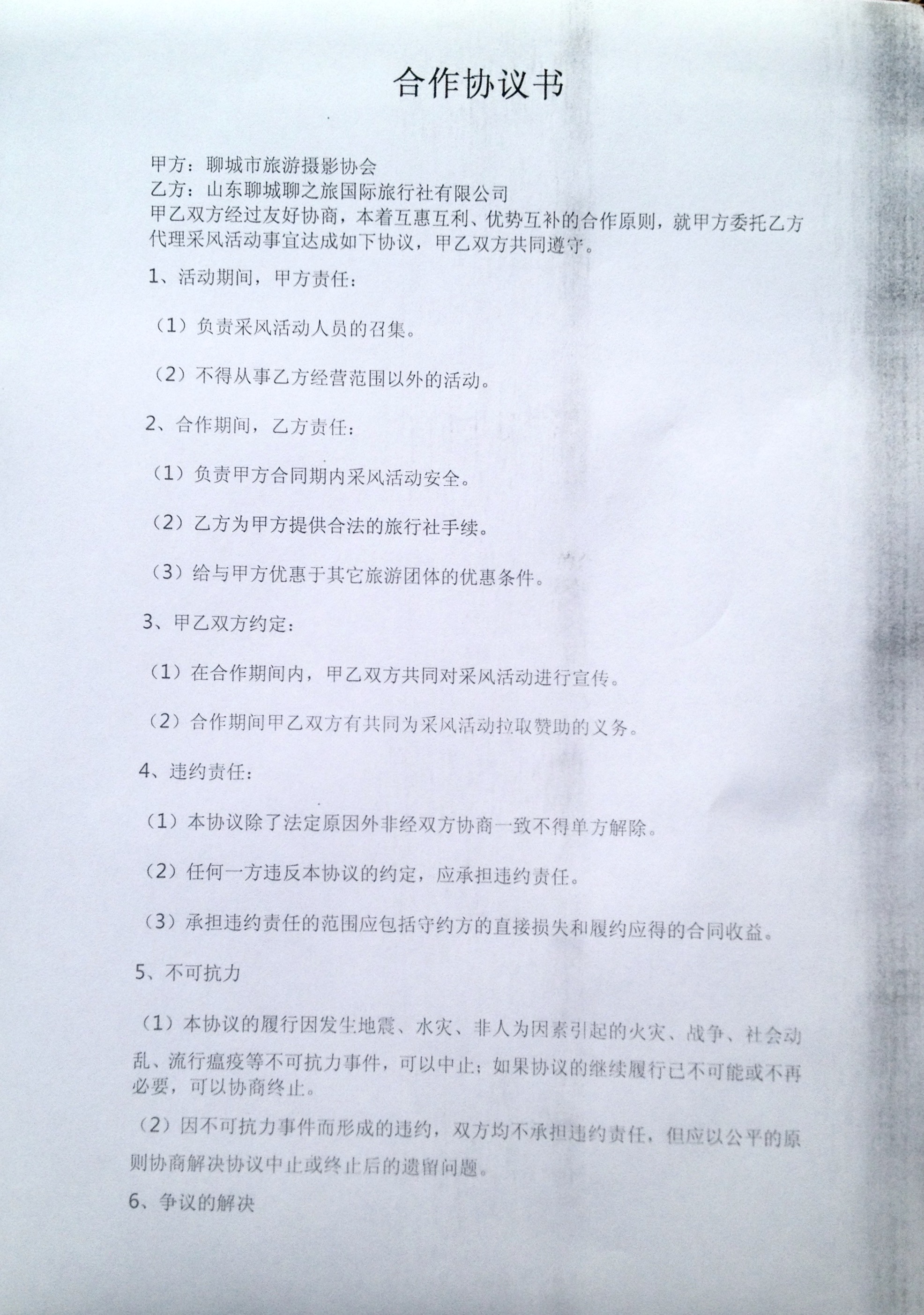 為響應(yīng)國家政策號召,聊城市旅游攝影協(xié)會委托我公司代理采風(fēng)活動事宜,雙方經(jīng)過友好協(xié)商,本著互惠互利、優(yōu)勢互補(bǔ)的合作原則,達(dá)成以下協(xié)議。