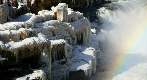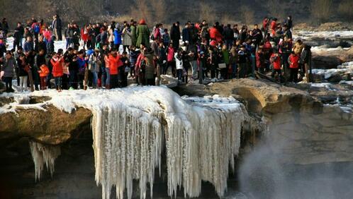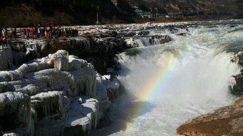 觀賞黃河壺口瀑布黃河壺口瀑布,其奔騰洶涌的氣勢如同中華民族的精神。它西臨陜西省延安市宜川縣壺口鄉(xiāng),東瀕山西省吉縣。黃河至此兩岸石壁峭立,河口收束狹如壺口,故名壺口瀑布。瀑布落差9米,蘊藏豐富的水力資源。奔騰的黃河水聲震天地,絢麗的彩虹美輪美奐,輕煙生水底,冰掛透晶瑩,黃河壺口冬季美麗的自然景觀讓游人們流連忘返。