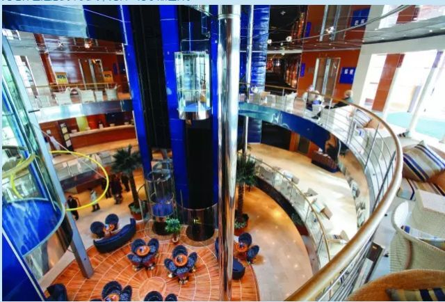 ?走進(jìn)中廳,一眼竟能仰望到10層甲板,大堂的柱狀吊燈是由意大利著名Murano玻璃制成,透明的觀光電梯也是意式華美風(fēng),宛若一方水晶世界。