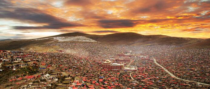 喇榮溝的一條峽谷里面,峽谷兩旁的都是密密麻麻的小紅房子,里面住著兩三萬(wàn)僧眾。進(jìn)溝左側(cè)住著的是女眾,稱(chēng)為覺(jué)姆;進(jìn)溝右側(cè)住著的是男眾,稱(chēng)為喇嘛;峽谷中間屹立著兩座高大雄偉的經(jīng)殿,這里是僧眾上課的地方,靠近溝口的是女眾經(jīng)殿,靠里面的是男眾經(jīng)殿。進(jìn)入佛學(xué)院以后,可以去參觀他們上課的經(jīng)殿,還可以在一旁旁聽(tīng),近距離的感受藏傳佛教的魅力。大片的紅房子也一道靚麗的風(fēng)景線,可以爬到上頂,拍這壯麗的全景。在佛學(xué)院背面的上坡上,每天都要舉行一場(chǎng)盛大儀式---