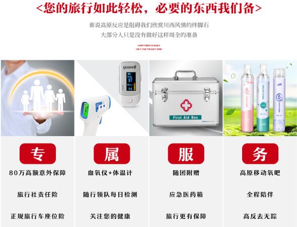 4.一份專(zhuān)業(yè):全團(tuán)配備公用應(yīng)急藥箱1個(gè)、全團(tuán)配備公用血氧儀1個(gè)、全團(tuán)配備溫度計(jì)1支、全團(tuán)貴賓每日血氧監(jiān)測(cè)1次,線路專(zhuān)屬紀(jì)念橫幅1條、各種擺拍新潮手拉旗子若干。刷出來(lái)的好評(píng)叫營(yíng)銷(xiāo),做出來(lái)的好評(píng)叫品質(zhì)!
