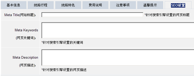 (2)(網(wǎng)頁關(guān)鍵詞):針對搜索引擎設(shè)置的關(guān)鍵詞 填寫線路內(nèi)包含的景區(qū)景點名稱,以及涉及到的地名?。ㄈ纾褐蕖?、省份、市、區(qū)、縣等地名)