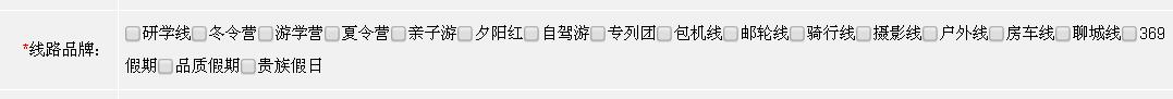 (3)線路品牌:可多選。 (線路品牌有嚴(yán)格的限制,比如攝影和戶外線,這個是需要專業(yè)領(lǐng)隊帶隊的,再,包機線路,必須是包機線路才可以,不是所有的飛機團都是包機;線路必須定位準(zhǔn)確,客戶才能最短時間找到哦。這個選項不是必選的,常規(guī)的行程可以選擇后面三個 369假期,品質(zhì)假期,貴族假日 其中一個 分別代表公司產(chǎn)品低端 中端 高端 的分類)