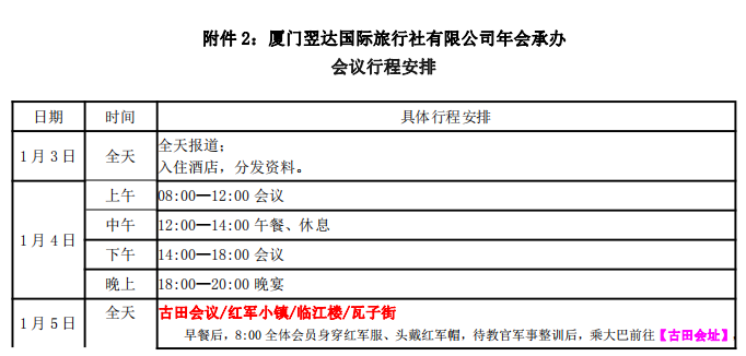 2、會(huì)議時(shí)間:2019 年 1 月 3 日→6 日。其中 3 號(hào)報(bào)到,4 號(hào)年會(huì)會(huì)議,5、6、號(hào)(6 號(hào)下午 5 點(diǎn)結(jié)束行程考察,不含 6 號(hào)晚餐及 6 號(hào)晚住宿)古田會(huì)議經(jīng)典路線考察(含古田會(huì)址、中復(fù)村、松毛嶺等)。