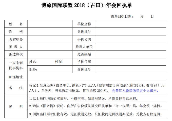 3、參會(huì)單位須如實(shí)填報(bào)《博旅國際聯(lián)盟 2018 年會(huì)回執(zhí)單》,連同年會(huì)匯款回單截圖按指定發(fā)送確認(rèn)(下詳)。