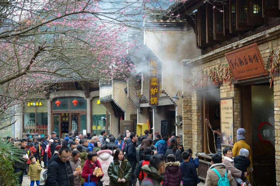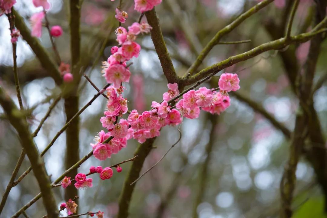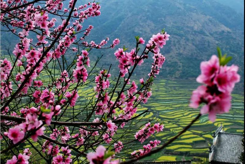 在這油菜花即將盛開的時(shí)節(jié),篁嶺的梅花、山茶花早先一步開放,天街道路兩旁,已是粉紅一片。