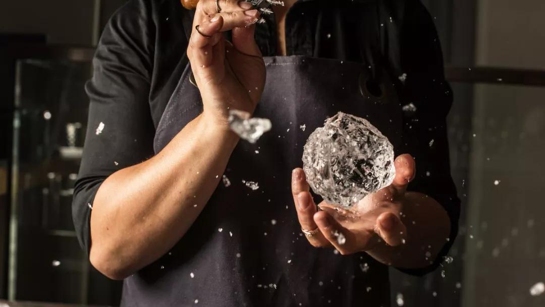 領(lǐng)悟到冰所攜帶的力量后,日本調(diào)酒師們很早便開始專研冰的藝術(shù)。所謂強(qiáng)將手下無弱“冰”,日本調(diào)酒師的手鑿冰球(Hand-carved ice balls)便是調(diào)酒界中的公認(rèn)精“冰”。他們會使用一些特殊器具,比如冰刀、冰鋸,來操練手中的冰塊。通常,他們先把一大塊巨冰切成小份,然后手拿“冰叉”鑿啊鑿,直到把冰塊鑿成球狀。聽起來很容易是嗎?但其實(shí),無任何保暖措施的手會被凍到毫無知覺,一個(gè)小小的失誤便會招來一趟醫(yī)院旅行。