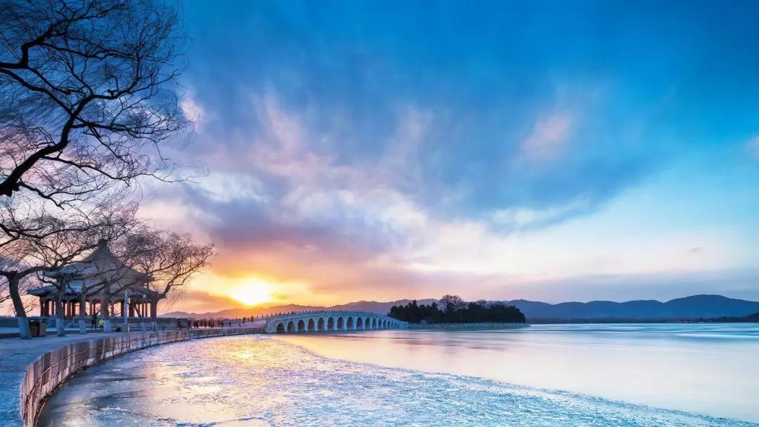 雖然沒有趕上“金光穿孔”的時(shí)候,但冬季的頤和園卻有著別樣的美。左側(cè)利用樹木,在突出季節(jié)特征的同時(shí),將草木、亭子、夕陽結(jié)合起來,讓十七孔橋變得生動(dòng)、鮮活。
