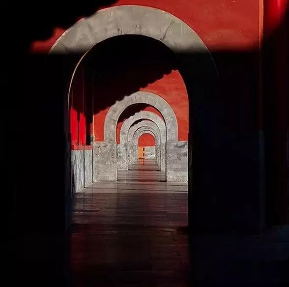 藍(lán)色的天空,紅色的宮墻,屋檐的影子打在宮墻上,加強(qiáng)了色彩的對(duì)比,讓畫面更加簡潔。