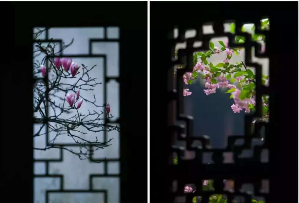 下面這幅圖,將門窗作為背景,能很好地表現(xiàn)園中景色的錯(cuò)落有致和韻味。