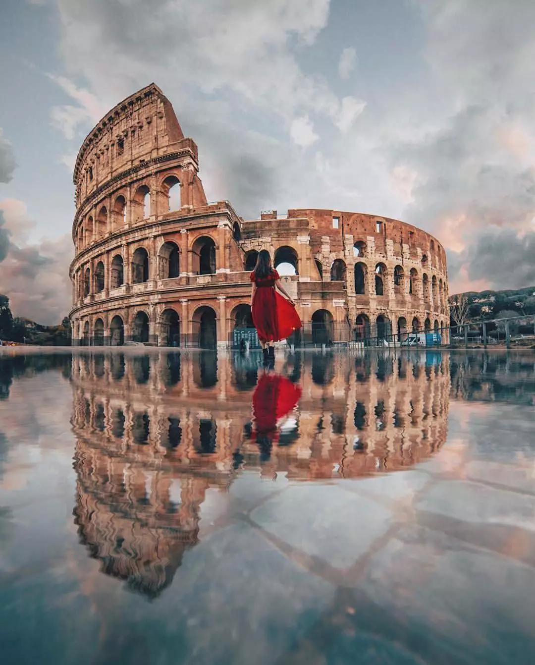 龐大的羅馬斗獸場(chǎng)與穿著一席紅裙的少女相融合,散發(fā)出一種古羅馬的人文氣息,水中的倒影又給畫(huà)面增添了一絲絲神秘夢(mèng)幻感。