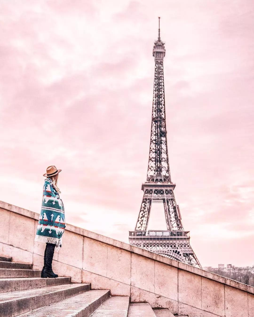巴黎鐵塔邊的女孩,畫(huà)面以粉色調(diào)為主,洋溢著濃濃的浪漫主義風(fēng)情。