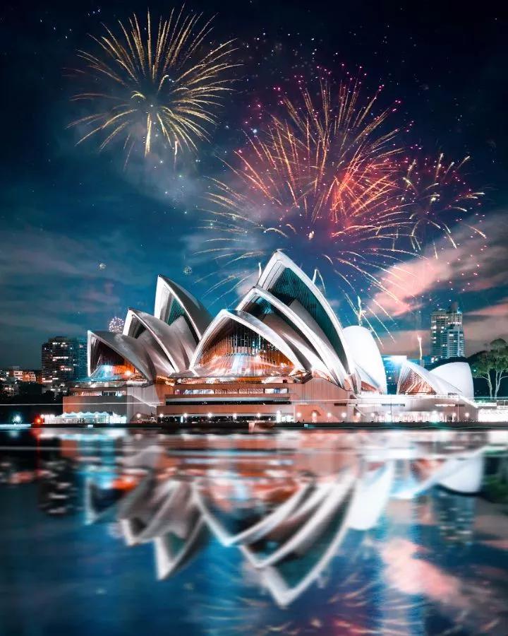 拍攝澳大利亞悉尼歌劇院,采用中景拍攝,將歌劇院特有的帆造型展現(xiàn)在觀者面前,感受建筑設(shè)計(jì)的獨(dú)特魅力,夜空中綻放的煙花讓畫(huà)面更有趣味性,烘托出熱鬧的氛圍。