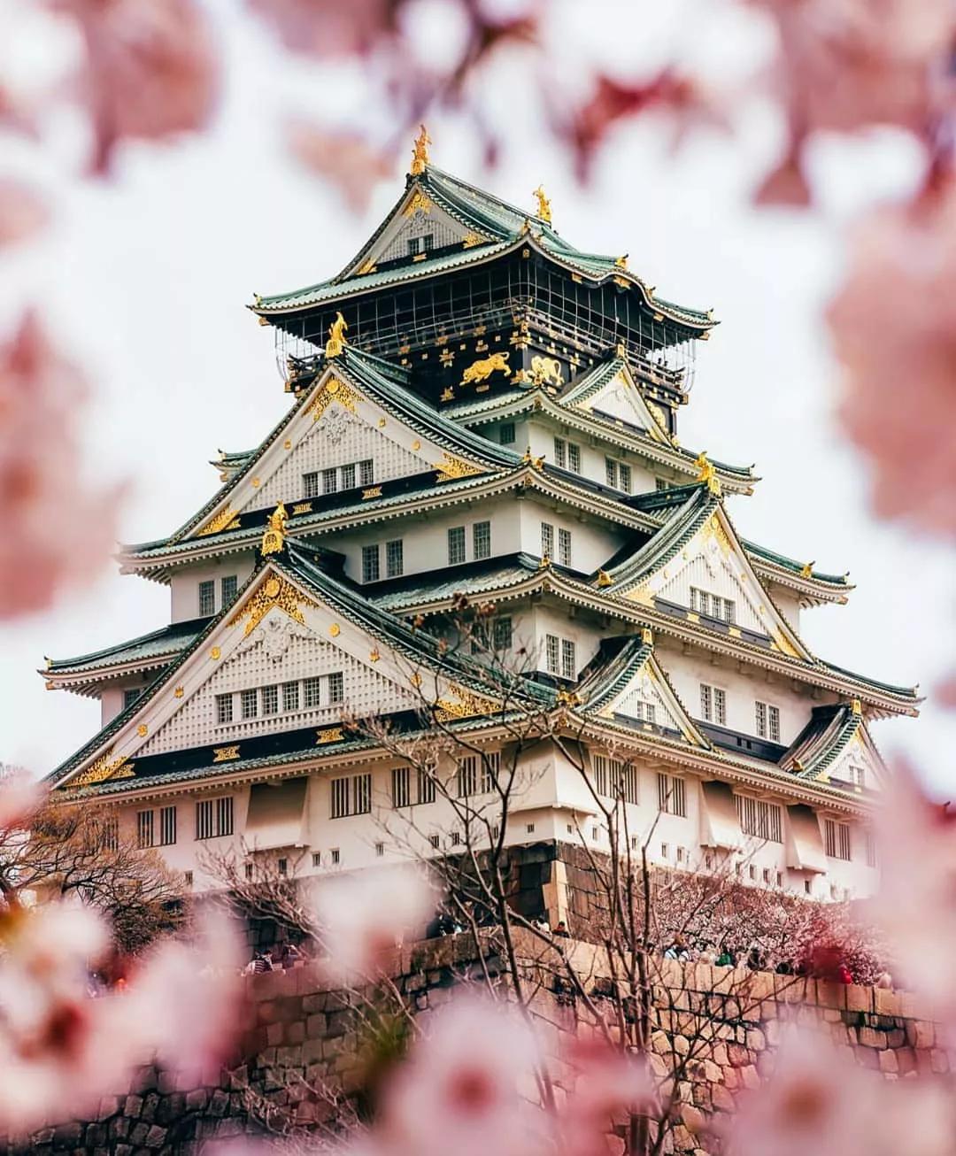 春季的日本大阪城天守閣,四周滿是櫻花,以櫻花為前景,將天守閣主體建筑放在畫(huà)面中,其巍峨雄偉的造型,鑲銅鍍金的外觀吸引著觀者的眼球。