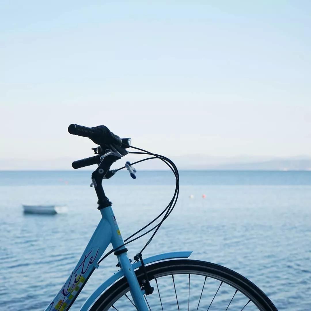 以虛化的大海與藍(lán)天為拍攝背景,畫(huà)面簡(jiǎn)潔而干凈,將自行車的車頭作為近景拍攝的主體部分,藍(lán)色外觀與背景顏色相呼應(yīng),營(yíng)造出一種清新靜謐感,同時(shí)也突顯出自行車的架構(gòu)。