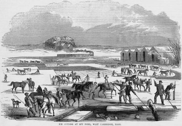 Spy Pond, Arlington 開采河冰的場景。都鐸的手下發(fā)明了一種用馬拉著的鐵質(zhì)刀具切割河冰。