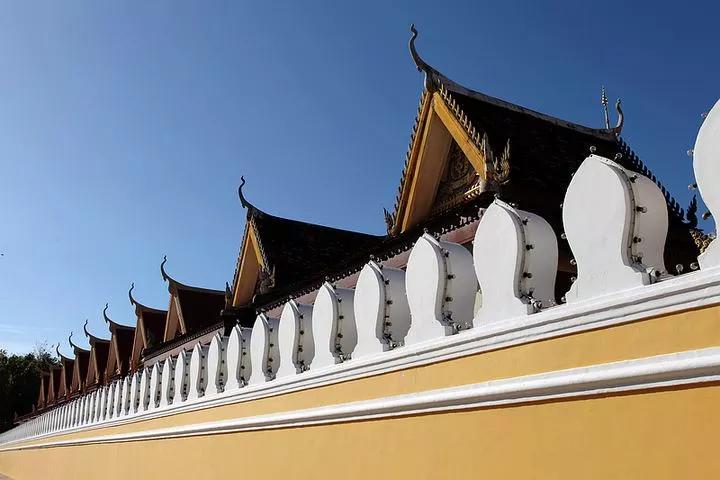 金邊皇宮是諾羅敦國王于1866-1870年建造的,充滿高棉傳統(tǒng)建筑風格和宗教色彩?;蕦m由一組金色屋頂、黃墻環(huán)繞的建筑組成,造型精美,金碧輝煌。