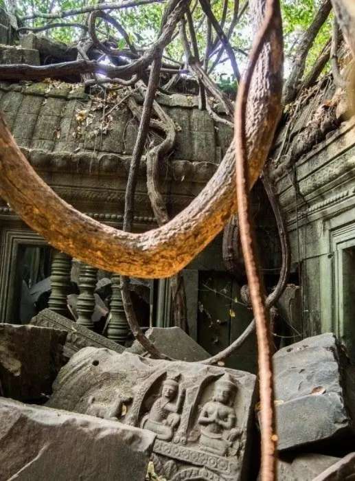 崩密列是吳哥窟公認(rèn)最神秘的寺廟,崩密列的歷史還處于不明狀態(tài),據(jù)學(xué)者推測大約建造于 11 世紀(jì)末至 12 世紀(jì)初,宮崎駿電影《天空之城》的原型,古寺搭配樹木、青苔、落葉建構(gòu)出唯美的意象。整個(gè)寺廟嚴(yán)重崩塌,石頭落了一地沒有任何保護(hù),感覺人人都可以撿走,被叢林層層覆蓋千年,各種被封死的的門,似乎里面隱藏著大秘密。