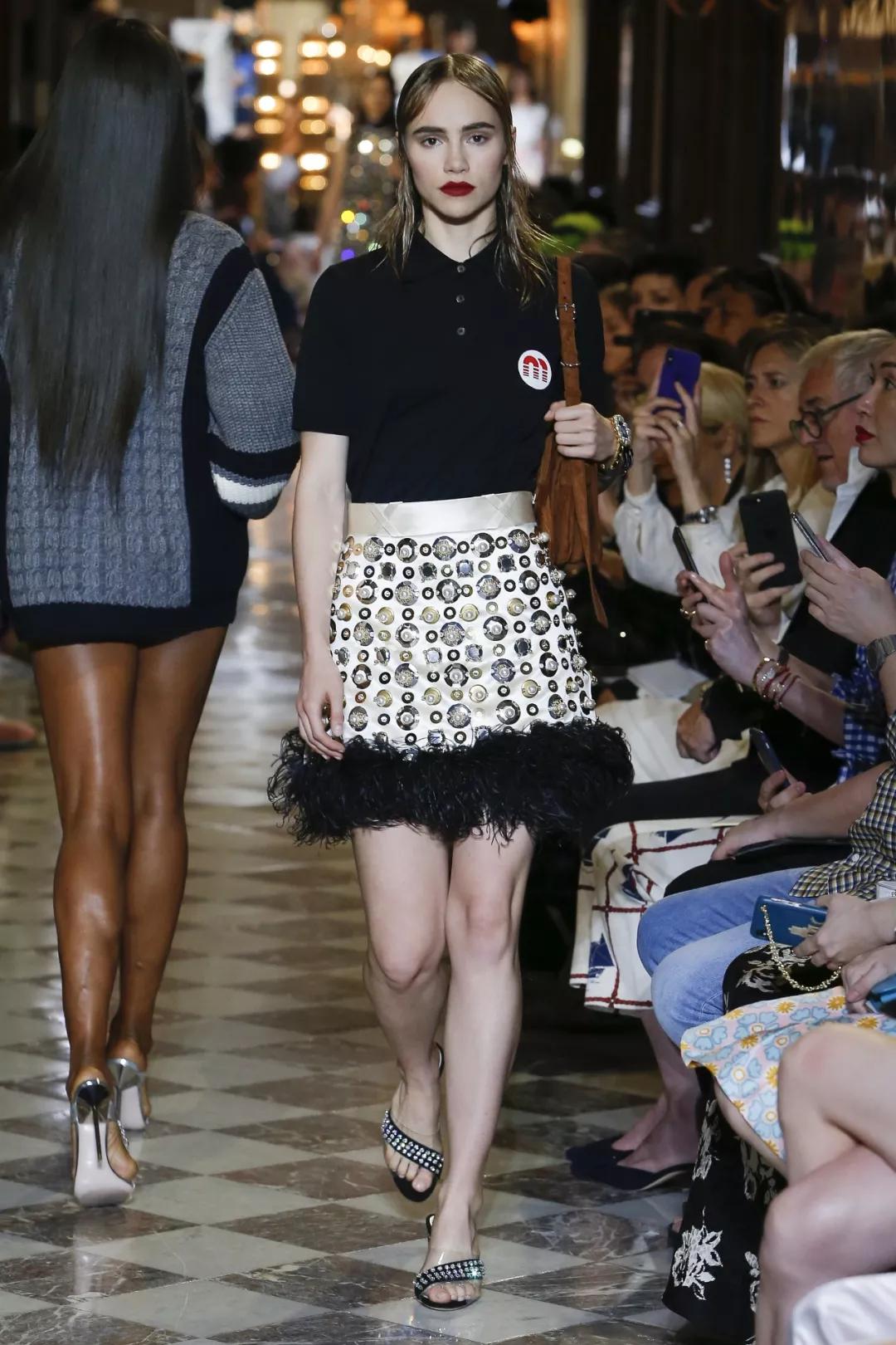 以Miu Miu 2019春夏度假系列為例,A型裙搭配Polo衫,完美再現(xiàn)了赫本風(fēng)貌,可裙子上的釘珠和羽毛,還是給《羅馬假日》中的淑女氣增添了幾分叛逆和華美,穿成這樣去度假,才是少女感的正確打開方式。