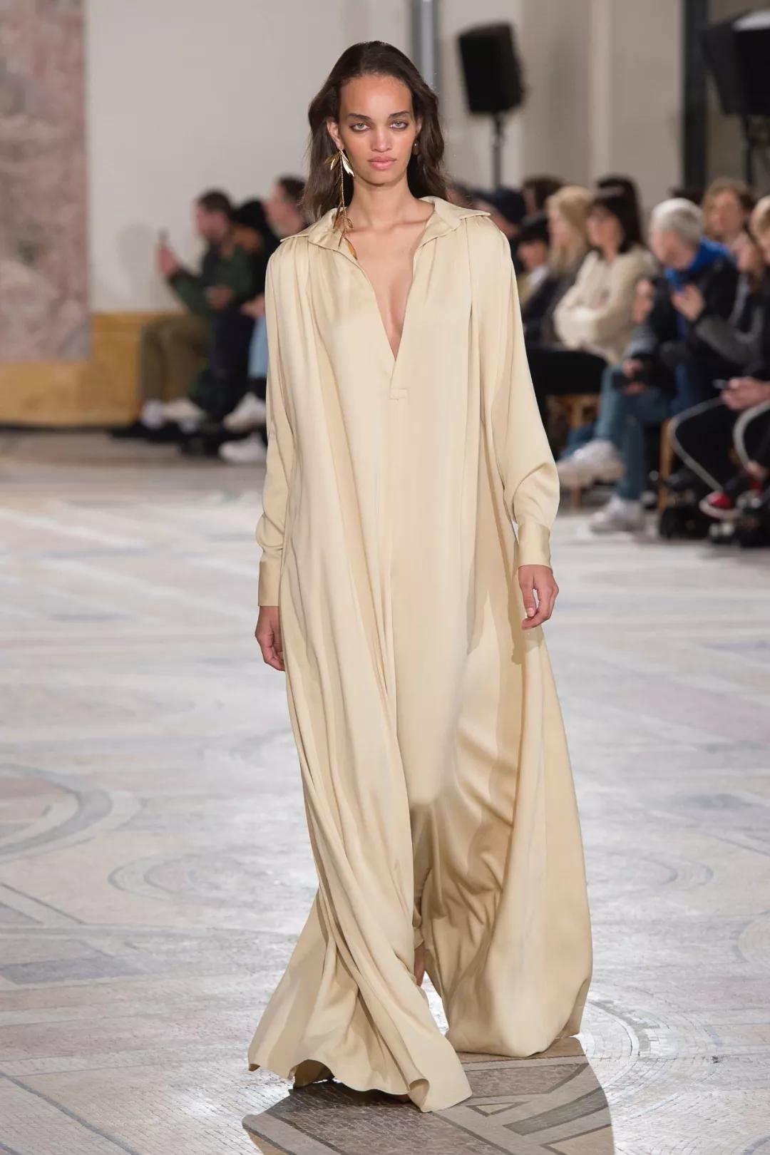 還是回到伸展臺上,頗具冷淡高級的品牌以簡潔高級的真絲印花巾與經(jīng)典款羊毛針織衫做拼接,將度假風(fēng)情融于基礎(chǔ)款式和高級材質(zhì)中;而那些垂墜感十足的真絲襯衫,和挺括又輕軟的亞麻半裙,則營造出強勢中不乏輕松的造型彰顯effortless時髦。