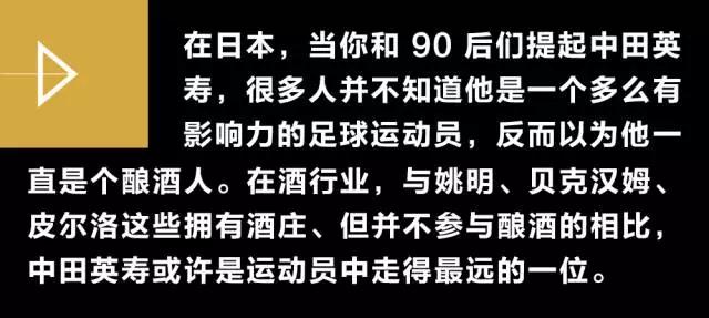 中田英壽帶著日本隊在世界杯與歐美諸強角力,個人則在英超意甲都有好表現(xiàn);現(xiàn)在釀酒,也跟日本最頂尖的酒廠合作,其出品只在海外市場售賣,而且并非只出現(xiàn)在日料店,在一些頂級西餐廳都有售——這可以說是代表了日本酒的高水平,欲與其它國家頂級美酒試比高的作品。他自己當然身兼“N”清酒的形象大使,經(jīng)常在世界各地做推廣,并嘗試以它來搭配各國菜肴。