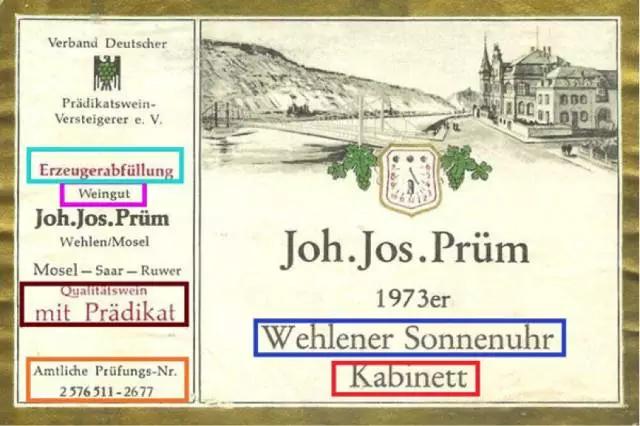 酒標中出現(xiàn)“er”結尾的單詞,一般都是地名,“er”你可以理解成中文 “的”。Wehlener Sonnenuhr即是Wehlen村的Sonnenuhr(日晷園)。Sonne德語中是“太陽”的意思,Uhr是“鐘表”的意思。又比如,Bernkasteler Doctor,“er”前面的Bernkastel是子產區(qū)名,Doctor就是著名的“醫(yī)生園”。這種情況,關鍵詞往往都是er后面出現(xiàn)的地名。