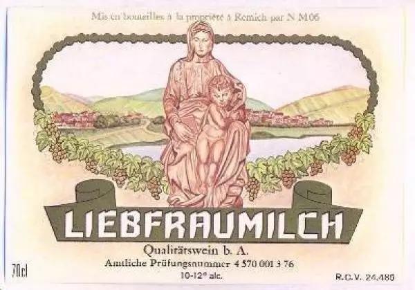 Liebfraumilch:“圣母之乳”。一種廉價的、半甜型的QBA酒,產自于萊茵高、那赫、萊茵黑森和法爾茨四個地區(qū),大多用高產量的穆勒塔戈葡萄(Muller-Thurgau)釀造。Lieb是德語“親愛”的意思,F(xiàn)rau意為“女士”,Milch意即“牛奶”。