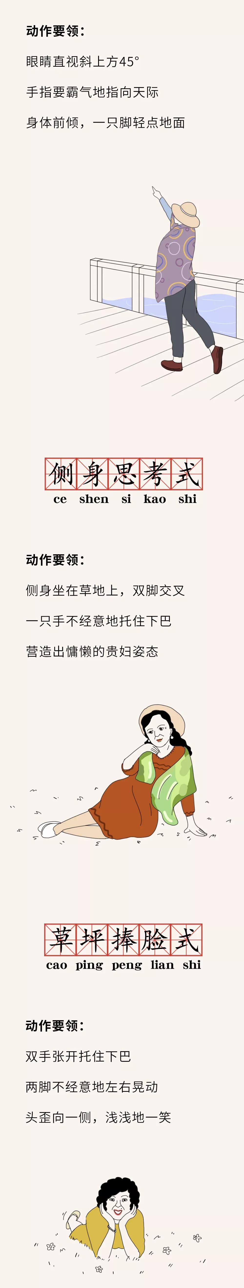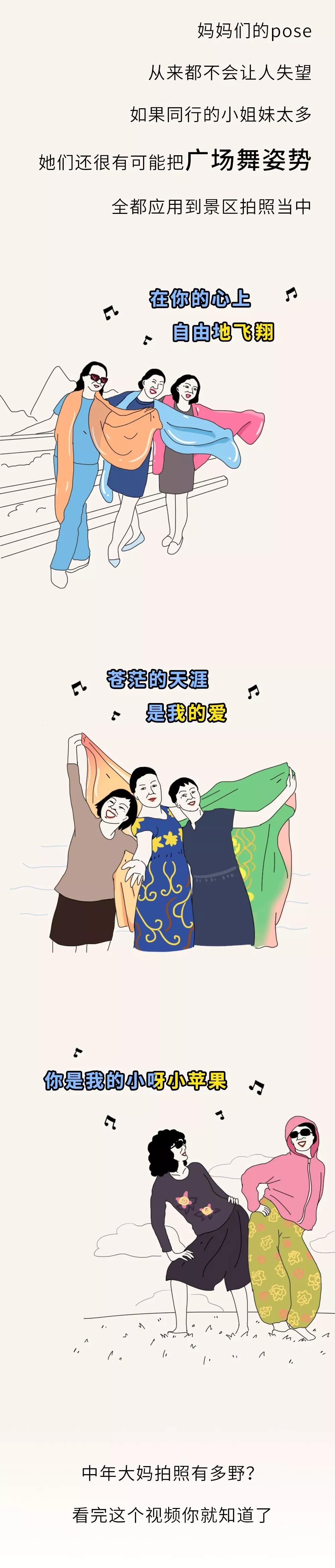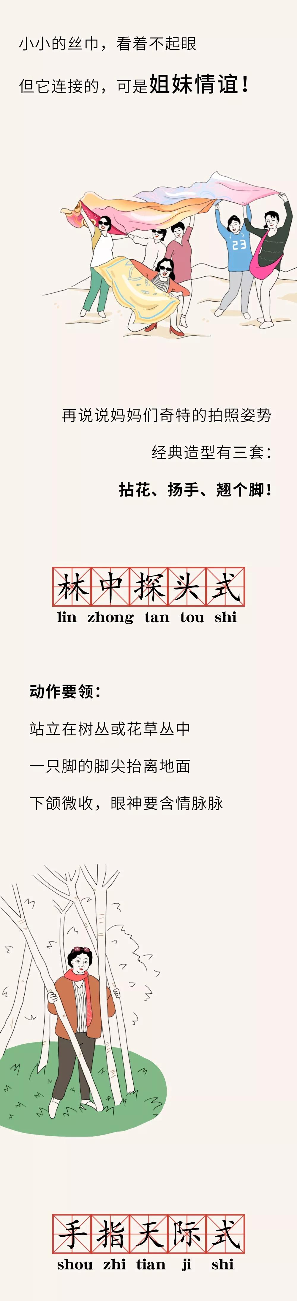 不得不佩服大媽們的新潮,當(dāng)90后拍照還在嘟嘴比剪刀手的時候,她們已經(jīng)研究出了各種奇特的拍照姿勢,分分鐘亮瞎你的鈦合金狗眼。廣場舞可以不跳,但拍照絕對不能含糊。拍照道具有三寶:墨鏡、絲巾、太陽帽,經(jīng)典造型有三套:拈花、揚手、翹個腳??赐晁齻兒托〗忝玫呐笥讶裾?,你總會忍不住哼起那句:最美不過夕陽紅,溫馨又從容……