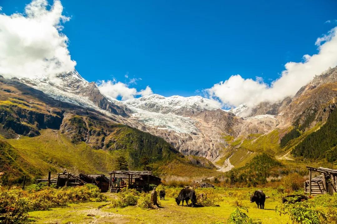 雪山、峽谷、飛溪、古樹、巨石、寺院