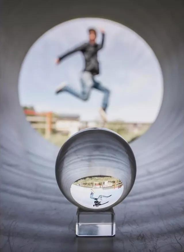 和其它需要大光圈虛化背景的玩法不同,這一玩法需要使用小光圈,讓整個(gè)畫(huà)面都清晰,使球內(nèi)倒錯(cuò)的線條、圖案和現(xiàn)實(shí)場(chǎng)景中圖案對(duì)應(yīng)起來(lái)。