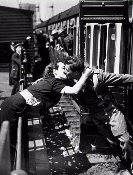 站臺前,隔著很遠的距離,姑娘奮力起身,吻到了久別的愛人。