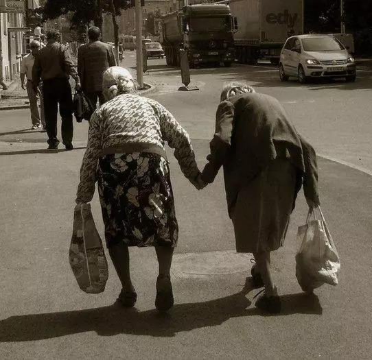 兩個年歲已經(jīng)很大的老奶奶,正牽著手慢慢地一步一步地往前走著。