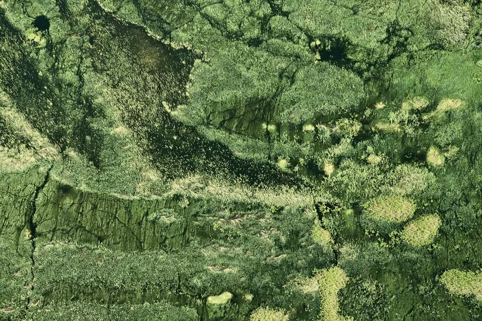 “在距離地面 50 至 500 英尺距離的拍攝中,你所能看到的地面風(fēng)景在真實(shí)清晰與抽象兩者之間徘徊,”塞克勒說(shuō)道,“而現(xiàn)實(shí)與抽象之間的那條界線讓我著迷?!?/span>