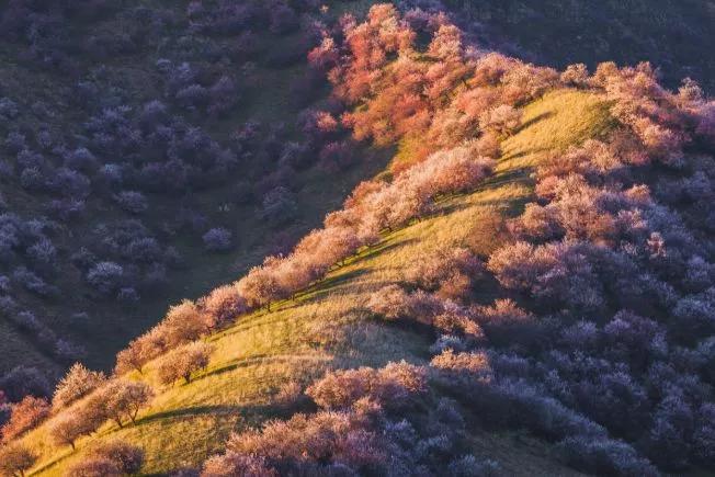 杏花溝山坡起伏,線條優(yōu)美,每到春暖花開(kāi)之際,隱藏在伊犁河谷深處的野杏林便變身人間仙境,完勝三生三世十里桃花。