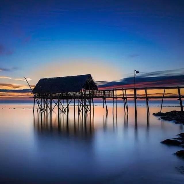 將水平線、地平線放在畫面的正中間,這種構圖方式在風光攝影中雖然不常見,但也會使用。比如,攝影師想要突出位于湖面上的小亭子,而小亭子又正好擁有一段很長的長廊。我們就可以將這段長廊作為一條水平線來構圖。