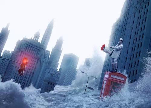 為什么這樣說?因為比起水平的地平線,略帶傾斜的地平線會更加具有動感,比如下面這張海報圖(不是真實拍出來的,只是拿來做個例子),它沒有一個明確的水平線,但是根據(jù)建筑物來參考,很明顯它是傾斜的,感覺人物站不穩(wěn)隨時都要倒下去,這樣就營造了一種緊張的氛圍,有助于表達情緒。