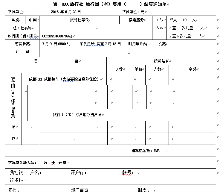 單項委托合同簽訂好之后,組團(tuán)社就應(yīng)該給團(tuán)隊或個人發(fā)一個費用結(jié)算通知單,敦促對方把錢劃在賬戶上。