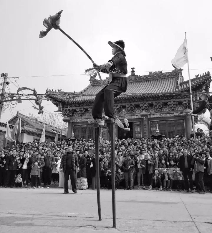 當(dāng)我們所處的拍攝環(huán)境比較雜亂時,就可以利用黑白攝影來淡化。比如下面這張攝影作品,攝影師想要突出的主體是踩高蹺的表演者,但是周圍圍觀的人以及建筑物作為陪襯體又不能舍棄,只能利用黑白攝影淡化周圍環(huán)境的色彩來突出主體。