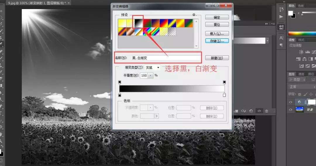 圖片導(dǎo)入進(jìn)來之后,點擊右下角半黑半白的圓形圖標(biāo)——選擇漸變映射——雙擊漸變條——選擇“黑,白漸變”確定即可。