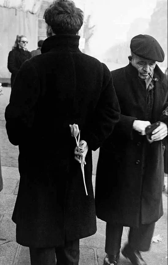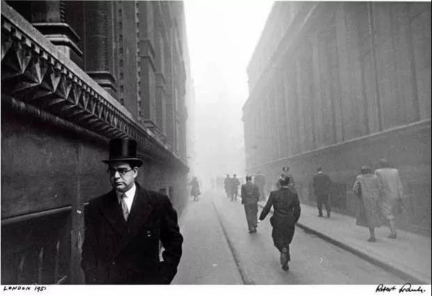 返回紐約后, 1949~1953 年期間,弗蘭克又多次前往歐洲各國,先是拍攝花都巴黎,制作了一本以鮮花為主題的影集,送給他的未婚妻;后來拍攝了英國倫敦濃霧中銀行家頭戴圓頂禮帽、身著大衣、手持雨傘或手杖來去匆匆的典型英國人形象,以及滿臉漆黑的威爾士礦工辛苦勞動的照片;在西班牙他捕捉到一頭背插匕首的牛面對斗牛士的精彩畫面。他在每座城市都尋找最有代表性的意象,通過片斷的、稍縱即逝和內(nèi)省的個人化影像,并將它們作為一個整體,共同表達他對該城市的感受。