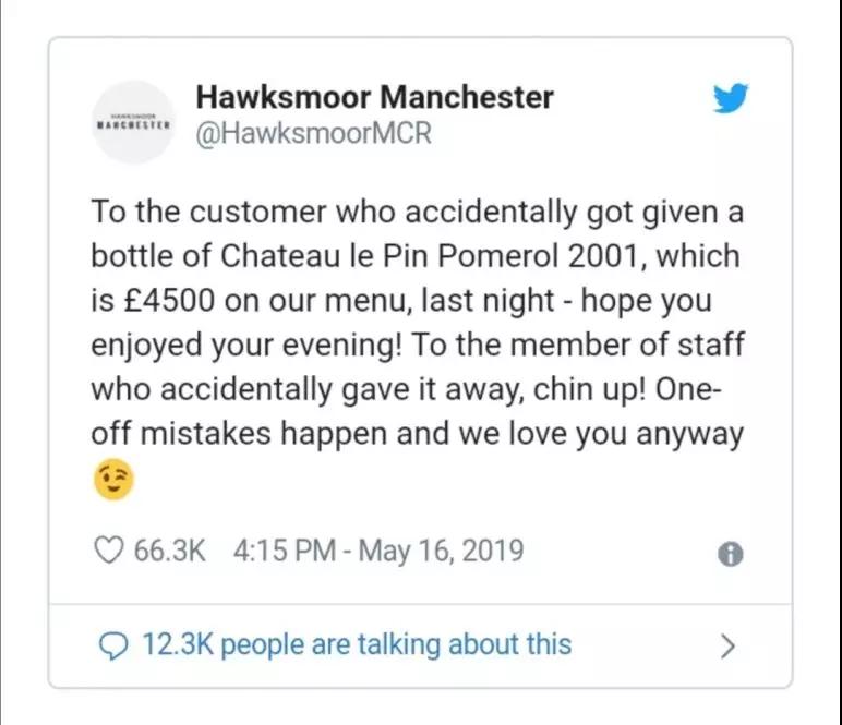 “昨晚意外喝了我們名莊酒的顧客,希望那瓶4500英鎊的2001年里鵬酒莊葡萄酒讓您度過(guò)了一個(gè)愉快的夜晚!不小心拿錯(cuò)酒的那位服務(wù)員,振作起來(lái)!人生難免犯次錯(cuò),我們依然愛(ài)你喲。”