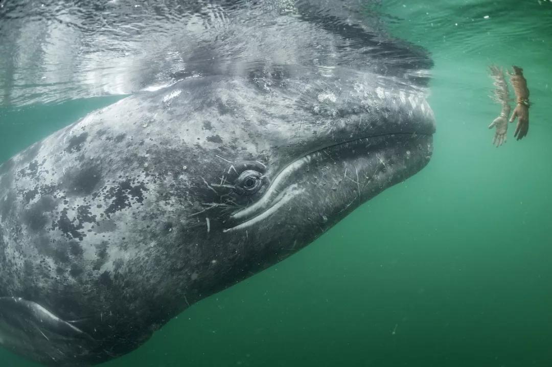 一頭好奇的灰鯨正在游向一位游客從水面游覽艇上伸下來的手。墨西哥下加利福尼亞半島中部地區(qū)圣伊格納西奧湖,灰鯨母親和她們的孩子們都會(huì)很積極的尋求和人類的接觸,讓人們撓一下自己的頭或者后背。