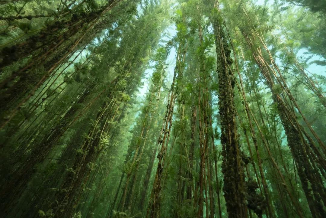 在他貼著水面游動(dòng)的時(shí)候,他突然發(fā)現(xiàn)一個(gè)巨大的長(zhǎng)矛消失在下面的雜草中。他向下游去,游近了才發(fā)現(xiàn)自己仿佛置身于一個(gè)水下叢林中, Michel 用廣角構(gòu)圖的方式營(yíng)造出一種置身于參天大樹的森林中,從地面向上凝視的感覺。