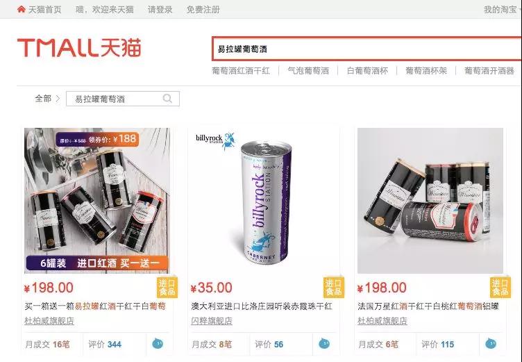 在天貓商城上搜索“易拉罐葡萄酒”,只出現(xiàn)了三款商品,月售量也很一般。