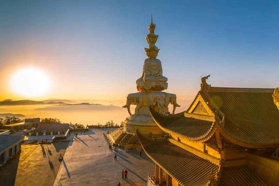 金頂擁有全世界最大的禮佛廣場,在這里你可以朝拜48米高的【十方普賢】,與如織游人一起進殿朝拜禮佛,披著金色日光與佛光交織而成的袈裟,體會全球最雄偉的佛教銅象的神圣和莊嚴;或是順著那清幽的羊腸小道,感受“一山有四季,十里不同天”的自然景色;還可以在舍身崖俯瞰川西平原的優(yōu)美風光,領(lǐng)閱一覽眾山小、風光無限好的意境;