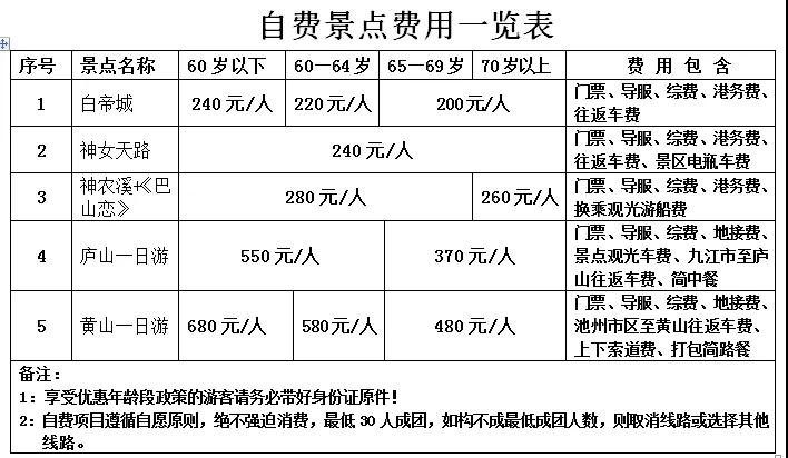 備注:已含景點(diǎn)按團(tuán)隊(duì)優(yōu)惠政策集團(tuán)采購(gòu),按景區(qū)規(guī)定請(qǐng)配合使用身份證原件進(jìn)入景區(qū),不參加不予退費(fèi),全程零購(gòu)物。
