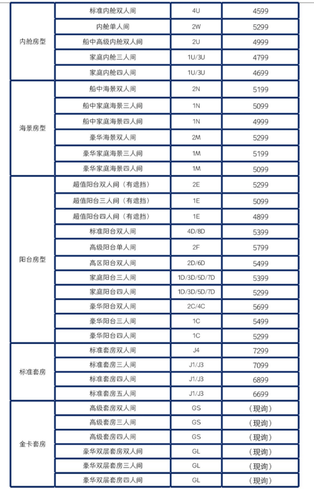 1、艙位價格詳情:
