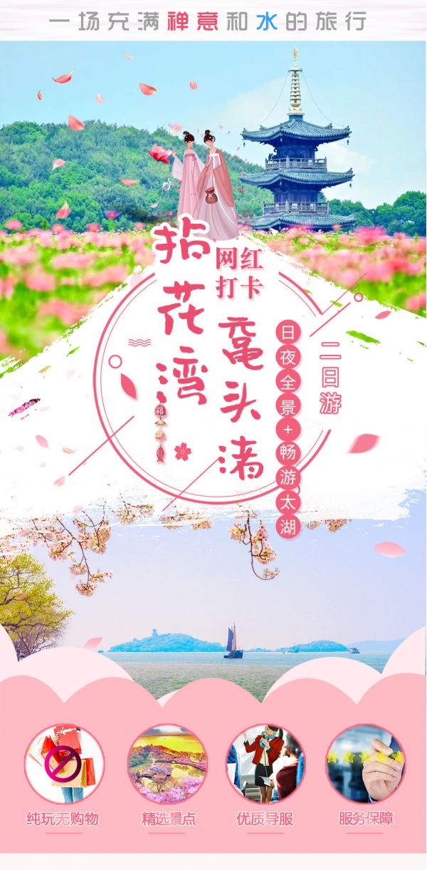 08:00——景點/場館前往:黿頭渚(含首道門票)黿頭渚是太湖北部的一處半島,形似浮黿翹首而得名。在這里你可以游覽龐大的園林群,坐船感受太湖的煙波浩渺,登太湖仙島一探秘境,也可以在春日來此品賞櫻花,體會“太湖佳絕處、畢竟黿頭渚”的意境。每年春季櫻花齊放是這里的一大奇觀,更有熱鬧的櫻花節(jié)。黿頭渚三面環(huán)水,既有山長水闊、帆影點點的自然美景,又有小橋流水的山鄉(xiāng)田園風光,是太湖山水景色大美之處。太湖仙島是黿頭渚必游之處,島上有道教仙宮和道、佛兩教石窟塑像。登臨半島上的鹿頂山可環(huán)顧湖濱翠色,天氣晴好時能看到湖面上的翩翩舟影,感受到太湖的浩淼之美。黿頭渚作為賞櫻之地,其獨特之處,一是“水陸空”全景式賞櫻。二是可以在夜晚賞櫻,櫻花與燈光結合,美不勝收。黿頭渚的早櫻一般于3月上旬開花,多為單瓣或半重瓣。依櫻花的開花時序,將其分為早、晚櫻,早開櫻花的類別多,花期(從初開、盛開到花落)一周時間,晚櫻花期可有7-10天,受升溫速度影響,早晚花期有5-12天的間隔,期間是一些雜交品種櫻花開放。一般3月中下旬的時候染井吉野櫻進入盛花期,也就是最佳觀賞期了。具體哪段時間進入盛花期需要看當時的天氣,如果有冷空氣的話,可能就會推遲盛花期。