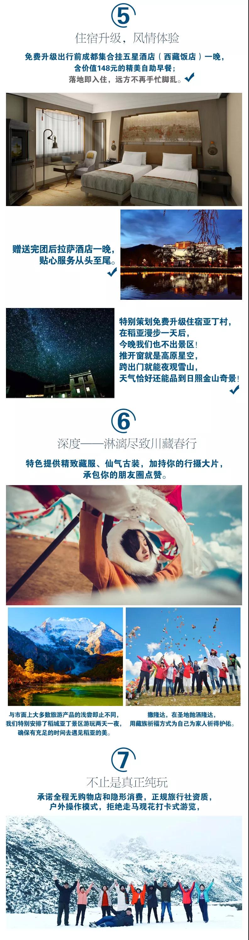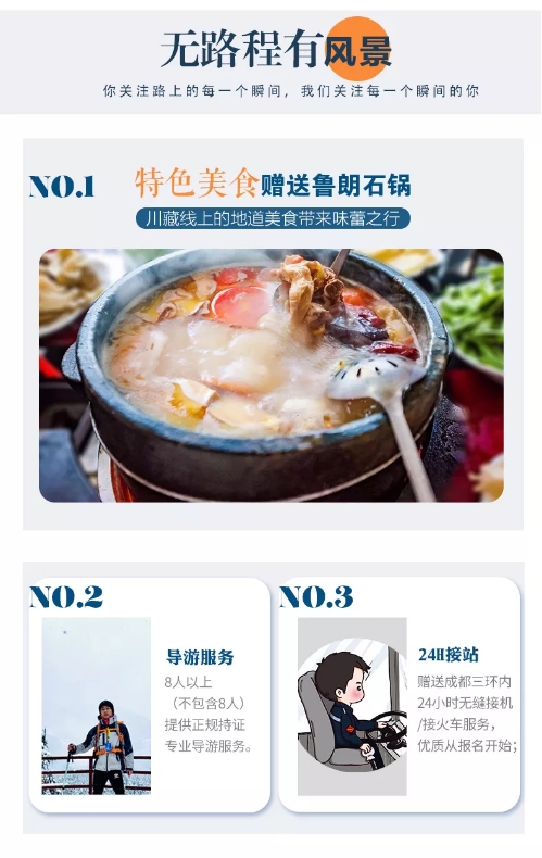 6、贈(zèng)送:贈(zèng)送魯朗石鍋雞,地道川藏美食(另外點(diǎn)菜需游客自行支付);贈(zèng)送戶外禮包旅游三寶、魔術(shù)頭巾、礦泉水;贈(zèng)送提供精致藏服、仙氣古裝,加持你的行攝大片;贈(zèng)送成都24小時(shí)專車接機(jī)接站服務(wù),給你最貼心的旅程。(贈(zèng)送項(xiàng)目不用費(fèi)用不退)