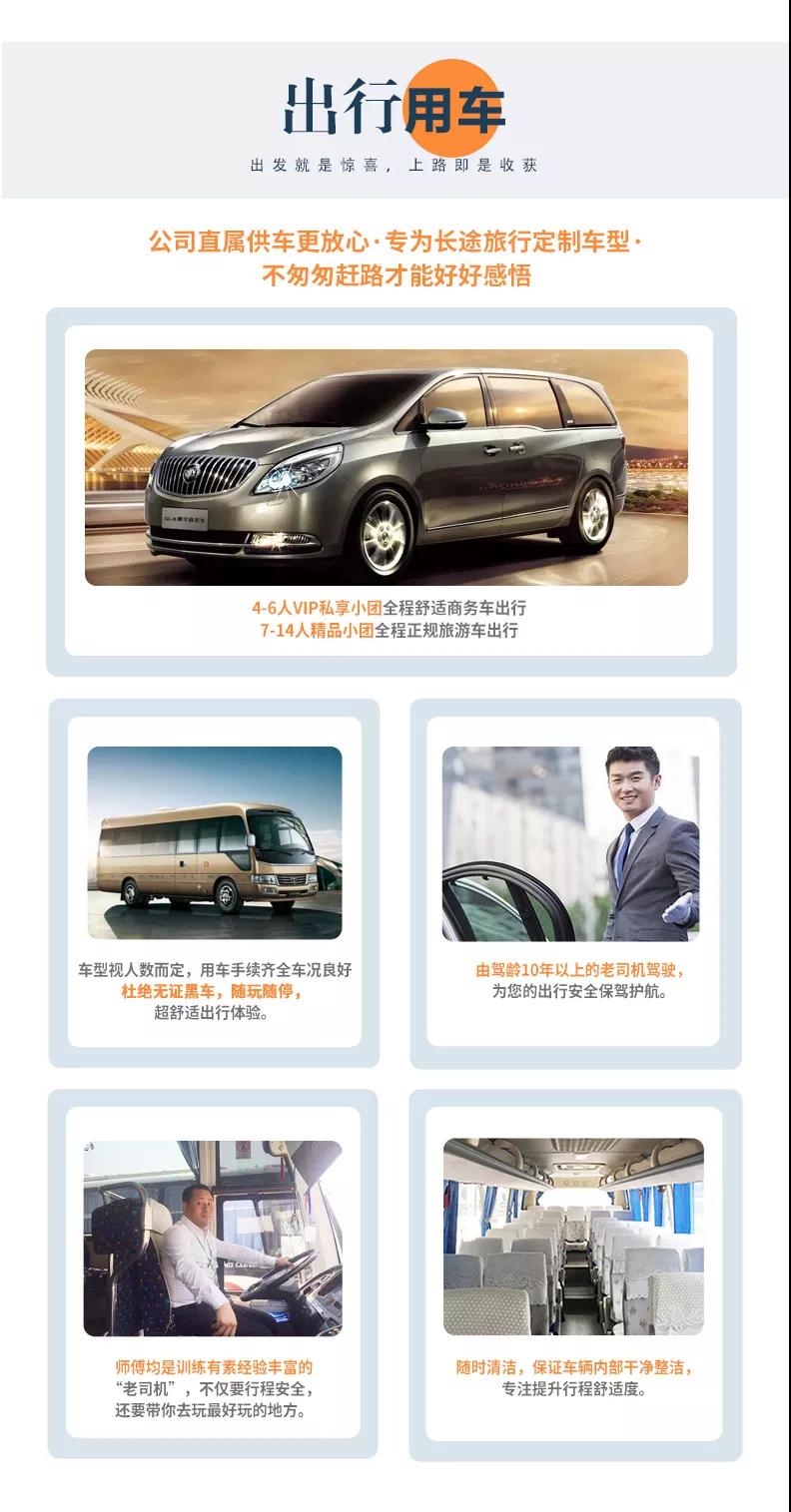 2、交通:4-6人VIP私享小團(tuán)全程舒適商務(wù)車出行,7-14人精品小團(tuán)全程正規(guī)旅游車出行;保證一人一正座位,車型大小根據(jù)實(shí)際人數(shù)安排,且由駕駛經(jīng)驗(yàn)豐富的司機(jī)為您的出行保駕護(hù)航,報(bào)價(jià)包含車費(fèi)、油費(fèi)、停車費(fèi)、維修費(fèi)及司機(jī)勞務(wù)費(fèi)。